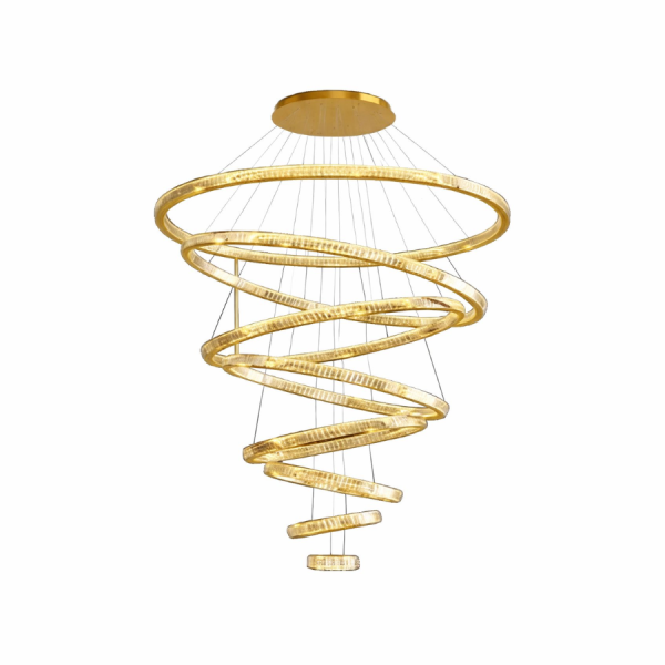 LED Integrado 8 luces Color: Dorado Medida: D160cm+D140cm+D120cm+D100cm+D80cm+D60cm+D40cm+D20cm Altura: 4mts Temperatura de color: Switch CCT (Tonos cálidos, neutros o fríos)